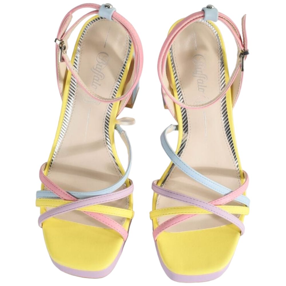Buffalo sandalo con tacco a blocco multicolor articolo Cherry cage 1291374. Scarpe con tacco realizzate in similpelle, cinturini a fasce iincrociati sul davanti, cinturino con fibbia ad incrocio alla caviglia, soletta memory foam, ptafform cm 2, tacco cm 10. Sandalo per cerimonia, feste e matrimonio.