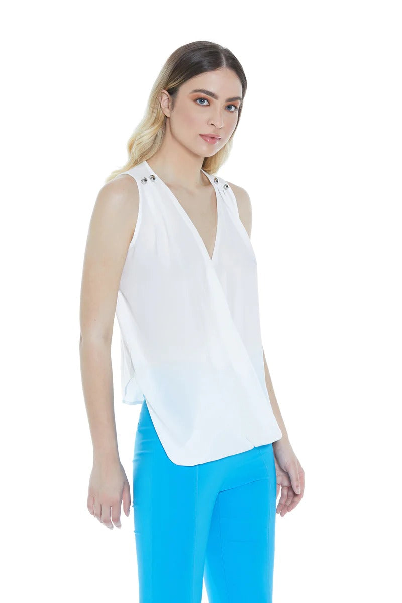 Relish canotta bianca articolo Lilia RDP2301046010. Canotta con scollo ad incrocio, borchie applicate e inserto georgette. Composizione: 50% cotone 50% poliestere